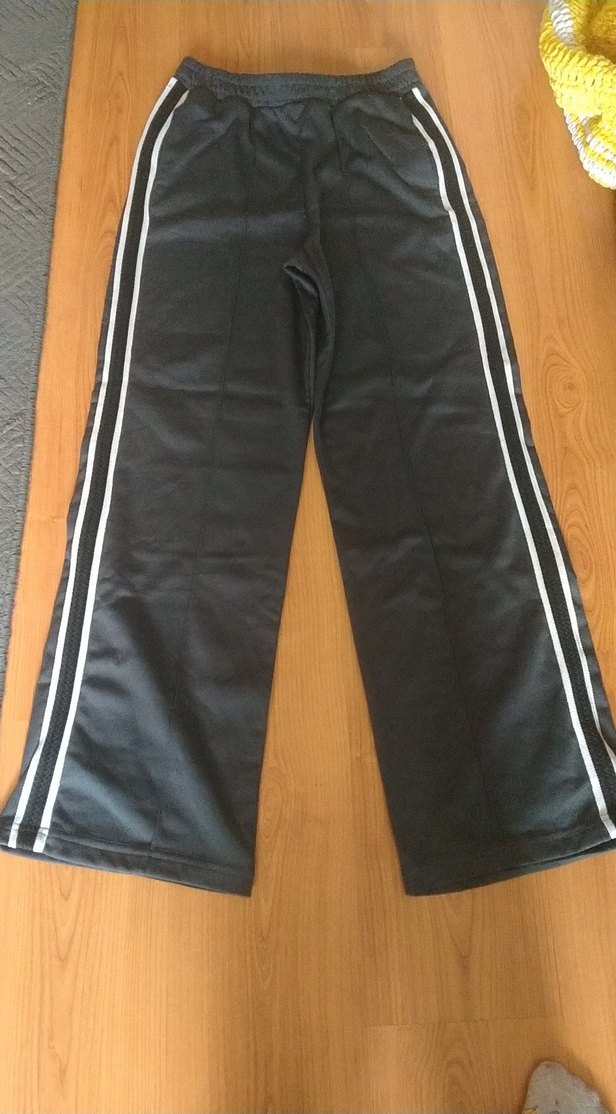 Siyah parlak, sentetik kumaştan, bel kemerli, bol kesim erkek spor pantolonu. Yanlarda beyaz şeritler bulunur, spor ve sokak stili için uygundur. ♂️
