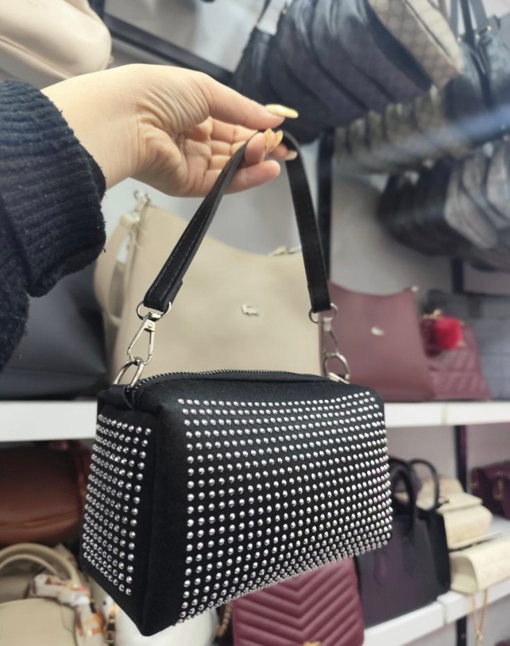 Siyah parlak deri, tokalı ve çivili baskılı rock punk tarzı çanta. Günlük kullanıma uygun.
