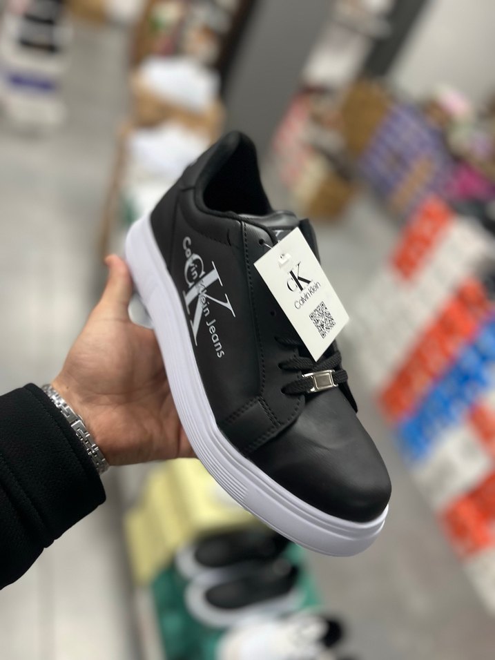 Siyah parlak yüzeyli, baskılı CK Jeans logo detaylı, velcro kapamalı ve kauçuk tabanlı erkek spor ayakkabısı. 40-45 arası numaraları mevcut