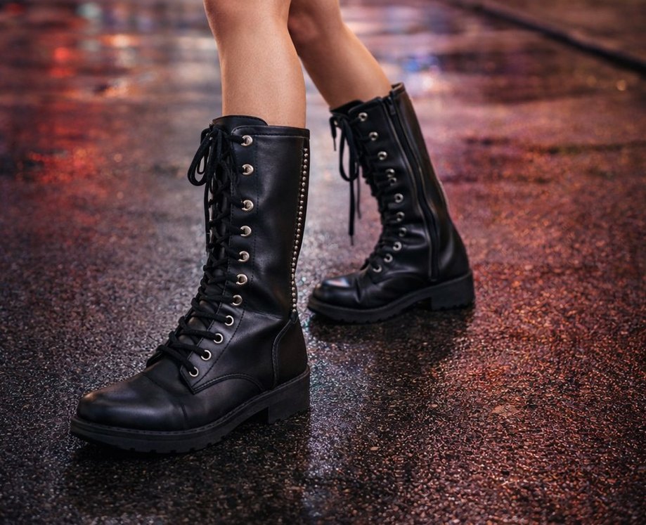 Siyah parlak deri, çizgili detaylı, blok topuklu ve bağcıklı tasarıma sahip botlar. Gotik ve grunge punk tarzıyla günlük kullanım için uygun.