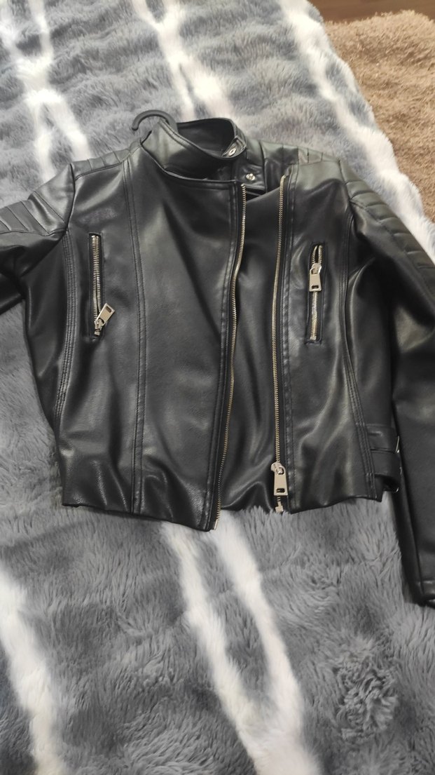 Bu siyah parlak deri biker ceket, yüksek yakalı ve fermuarlı detaylara sahiptir. Kısa boyda ve askılı kolludur, trend günlük tarz için uygundur.