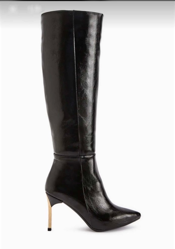 Siyah parlak deri dizüstü botlar, yılan desenli ve ince topuklu. Tokalı detayıyla ofis için şık ve çağdaş tarzda.