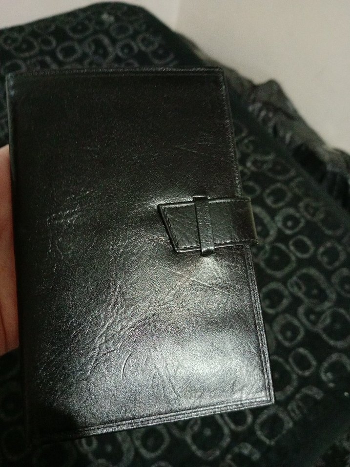 Ofis kullanımı için uygun, tokalı, siyah parlak deri erkek cüzdan, düz yüzey ve gotik tarzda.