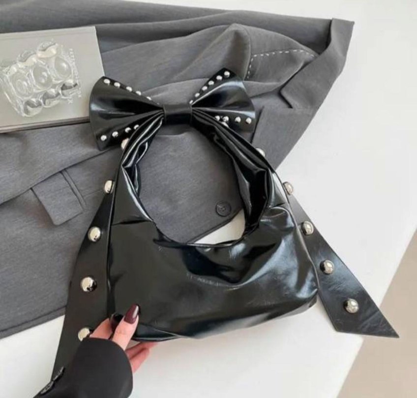 Siyah parlak deri çanta, fiyonk detayı ve gümüş çivilerle avant-garde gotik tarzını yansıtıyor.