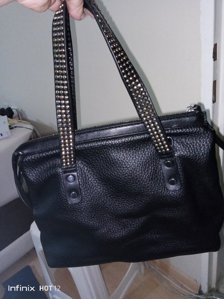 Parlak siyah deriden yapılmış, tokalı ve çivili kayışlara sahip gotik tarzda kadın çantası, günlük kullanıma uygun.