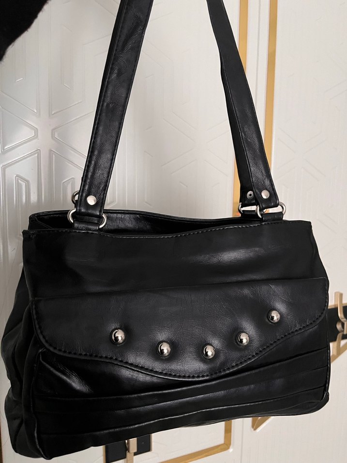 Parlak siyah deri, tokalı detaylara sahip cesur gotik tarzda kadın çantası, günlük kullanım için uygundur.
