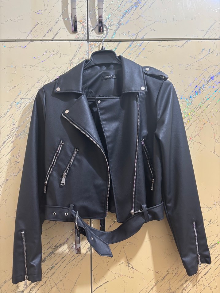 Siyah parlak deri biker ceket, fermuarlı cepler ve kesik yaka ile midi boyda, dar kesim ve askılı kollara sahip, trend sokak stili için uygun.