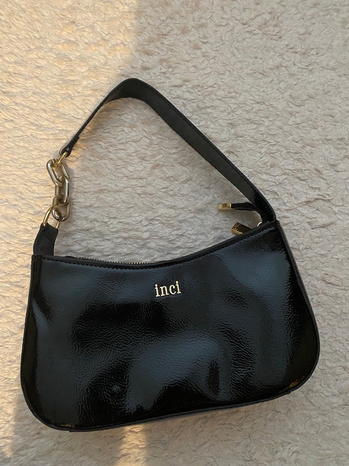 Siyah parlak deri, tokalı askılı ve "inci" yazılı minimalist goth tarzı kadın çanta, günlük kullanıma uygundur.