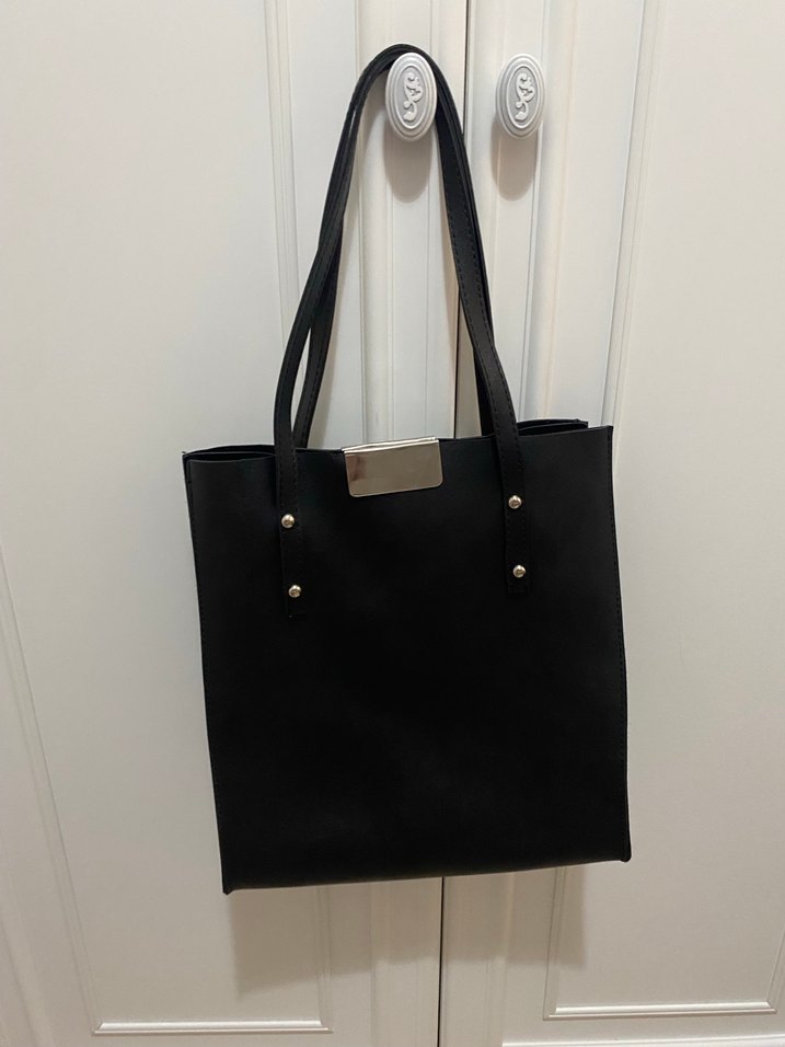 Siyah parlak deri, tokalı detaylı kadın çantası. Minimalist günlük kullanıma uygun.