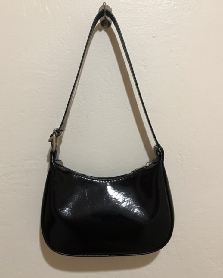 Siyah parlak deri kadın çanta, tokalı askısı ve minimalist tasarımıyla günlük kullanım için klasik gotik şıklık sunar.