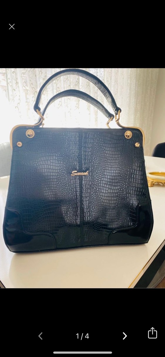Siyah parlak deri, yılan deseni ve tokalı detaylara sahip, modern klasik tarzda günlük kullanıma uygun kadın çantası.