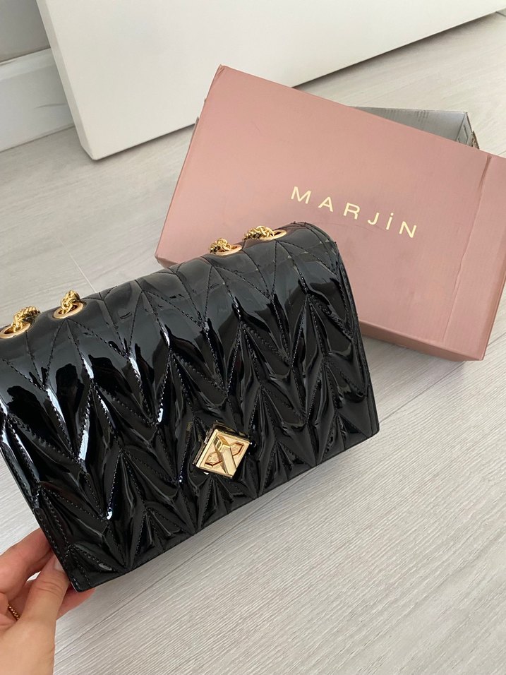Altın zincirli Siyah parlak deri kadın çanta, modern klasik tarzda. Marjin marka kadın kol çantası hiç kullanılmadı kutusuda duruyor fotoğraflardan inceleyebilirsiniz içine bakabilirsiniz Eni:24 cm Boyu: 17 cm Derinliği :8 cm