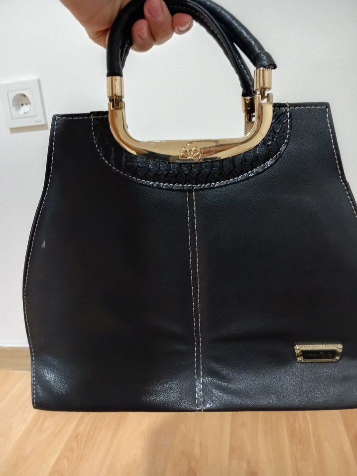 Siyah parlak deri kadın çanta, yılan derisi desenli ve tokalı kulplara sahip. Modern klasik tarzda, günlük kullanım için uygundur.