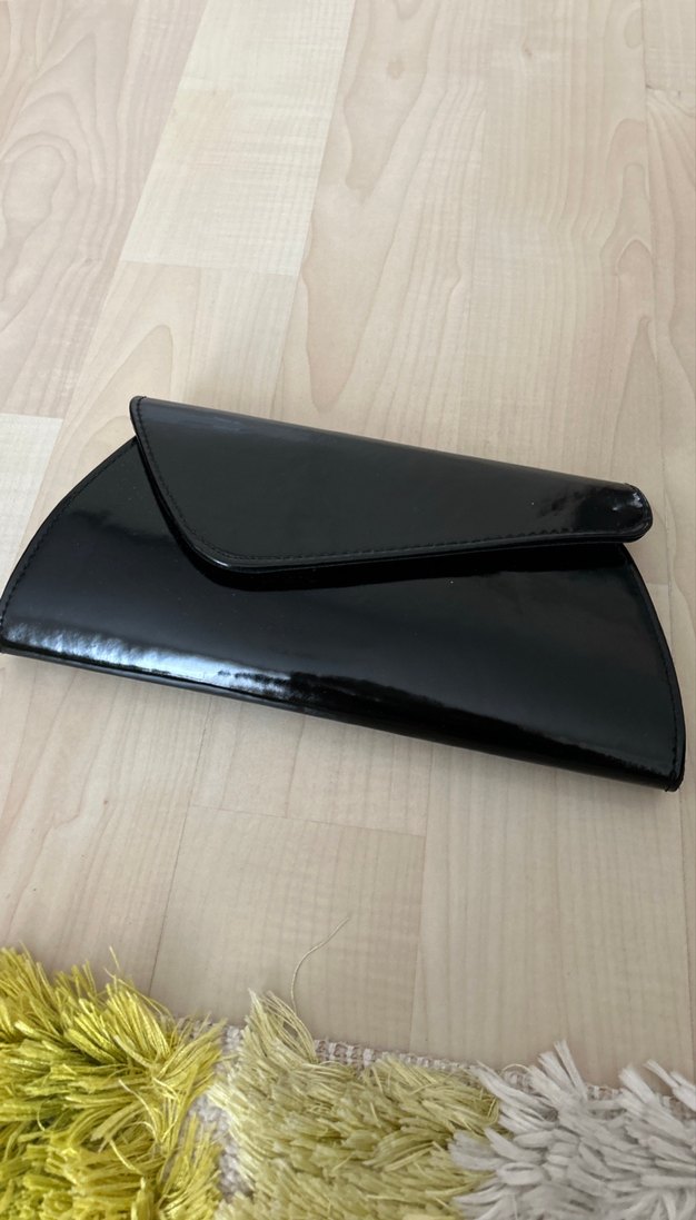Siyah deri, parlak yüzeye sahip kadın clutch çanta. Desensiz, klasik ve çağdaş tarzda, ofis kullanımı için uygun.