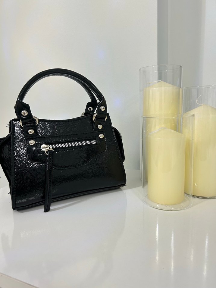 Parlak siyah deri el çantası, tokalı detaylara sahip, minimalist goth tarzıyla günlük kullanıma uygun.