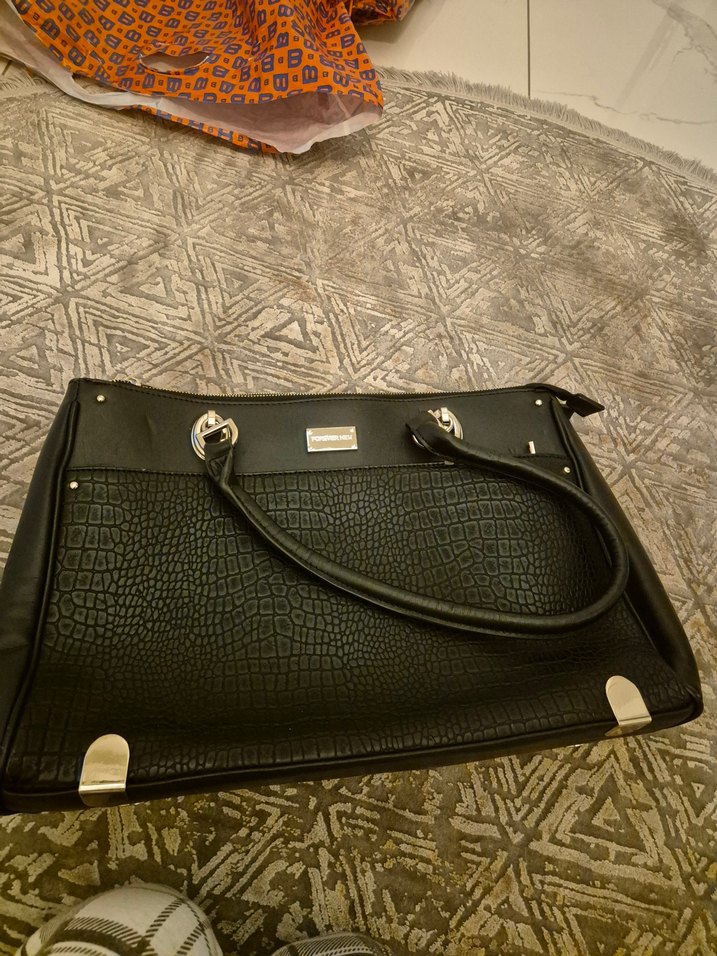 Siyah parlak deri, yılan desenli, tokalı saplara sahip kadın iş çantası. Çok az kullanıldı
