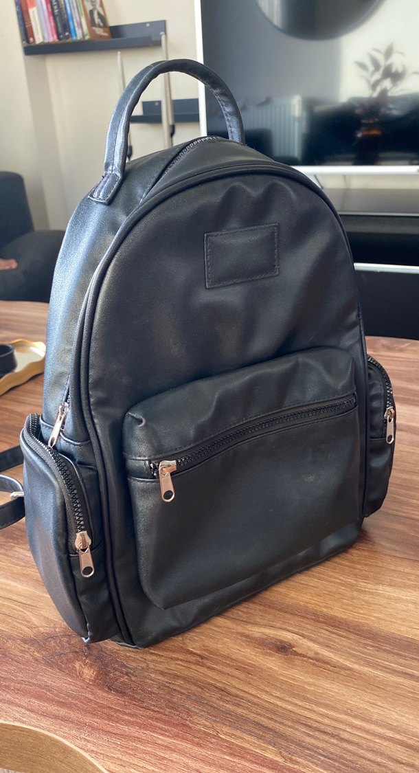 Siyah parlak deri sırt çantası, çoklu fermuarlı ceplerle. Tokalı ve minimalist biker tarzında, günlük kullanıma uygun.