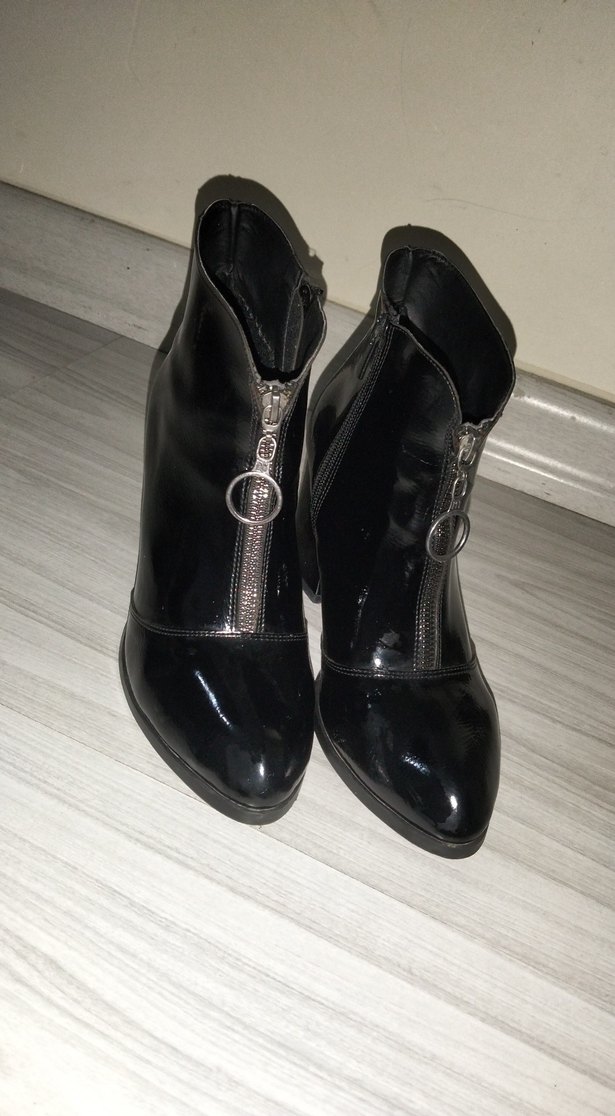 Siyah deri, parlak yüzeyli ve önde fermuarlı kemerli blok topuklu botlar. İnce yılan deseniyle gotik stile uygun.