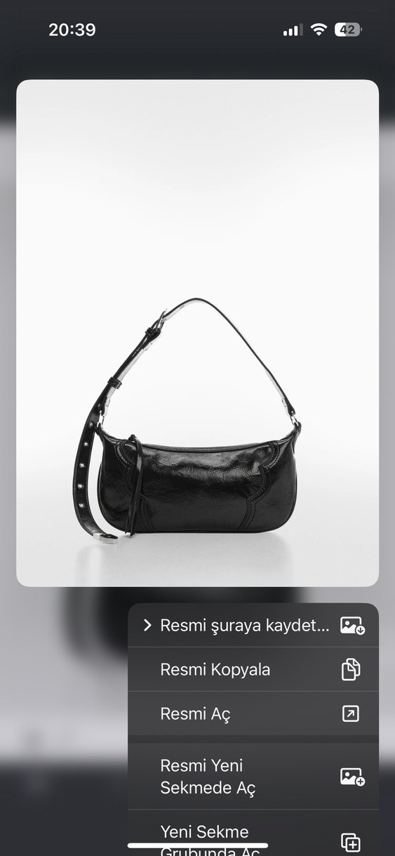 Siyah parlak deri, kemerli kadın çanta. Minimalist, deseniz ve günlük kullanım için uygun, sokak modasına uyumlu.
