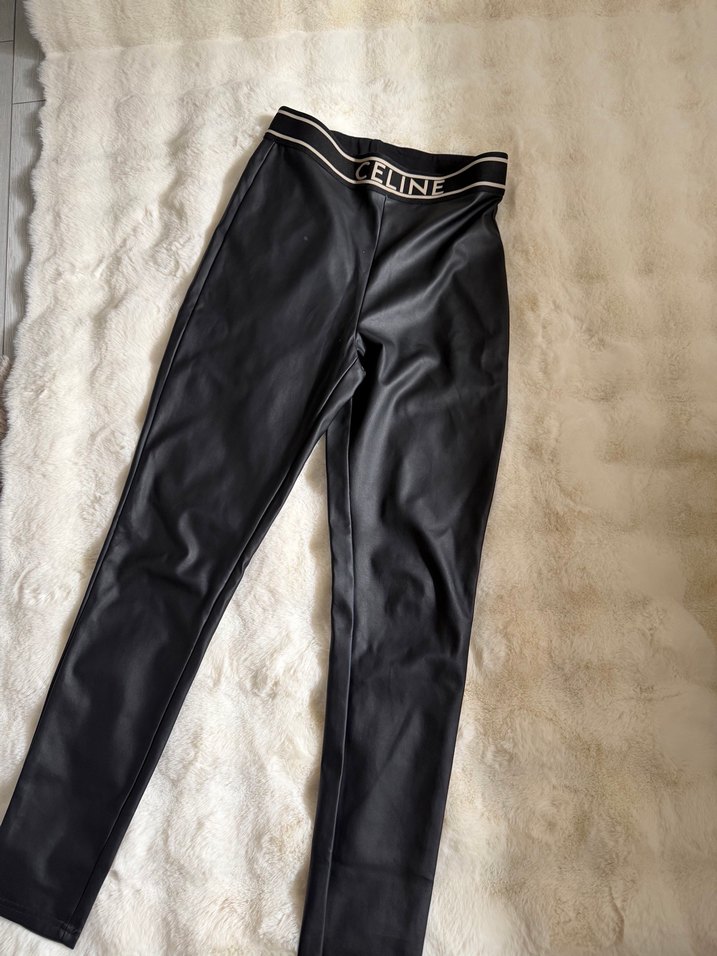 Parlak siyah deri, kemerli ve 'ELIN' yazılı bel detaylı, midi boy, dar kesim kadın tayt. Günlük ve sokak stili için uygun.