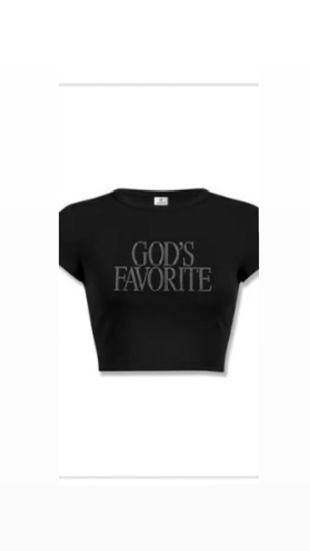 Parlak deri kumaştan, kısa kollu ve kısa boylu, üstünde "GOD'S FAVORITE" yazılı siyah fitted tişört. Yuvarlak yakalı ve gotik tarzda.