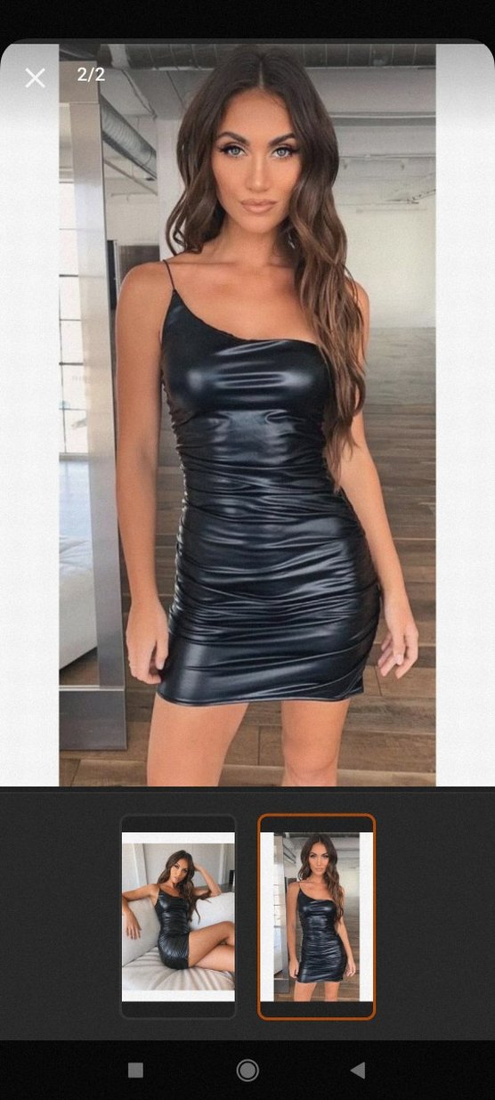 Siyah parlak deri dokulu kumaş mini elbise, straplez ve ince askılı. ✨Esnek kumaş S-M bedeni için uygundur. Hiç giyilmedi