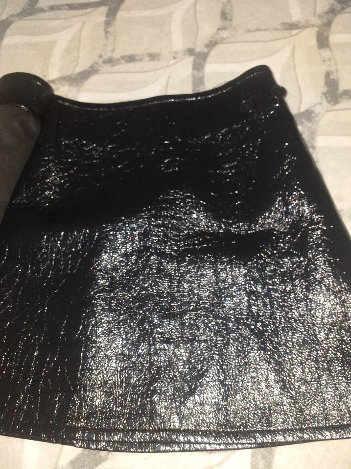 Siyah deri mini etek, parlak ve fit kesimiyle dikkat çeker. Avant-garde goth tarzı, günlük kullanıma uygundur.
