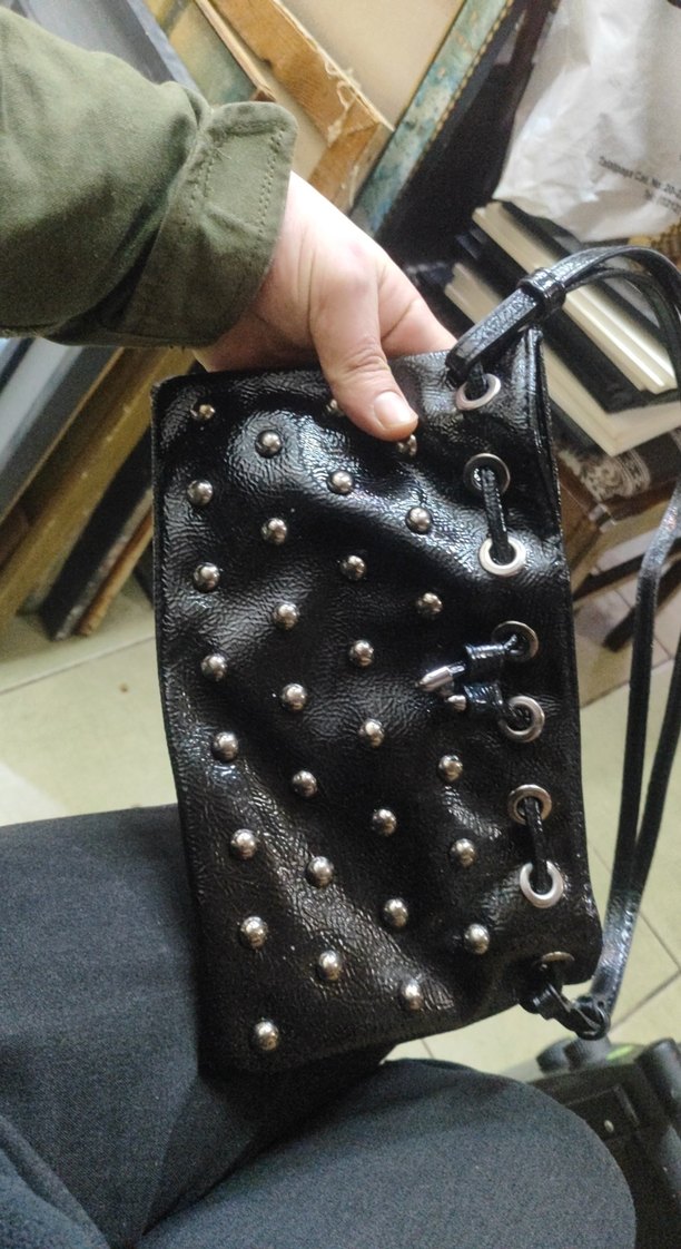 Siyah parlak deriden yapılmış, tokalı ve nakışlı perçin detaylı rock punk tarzı çanta.