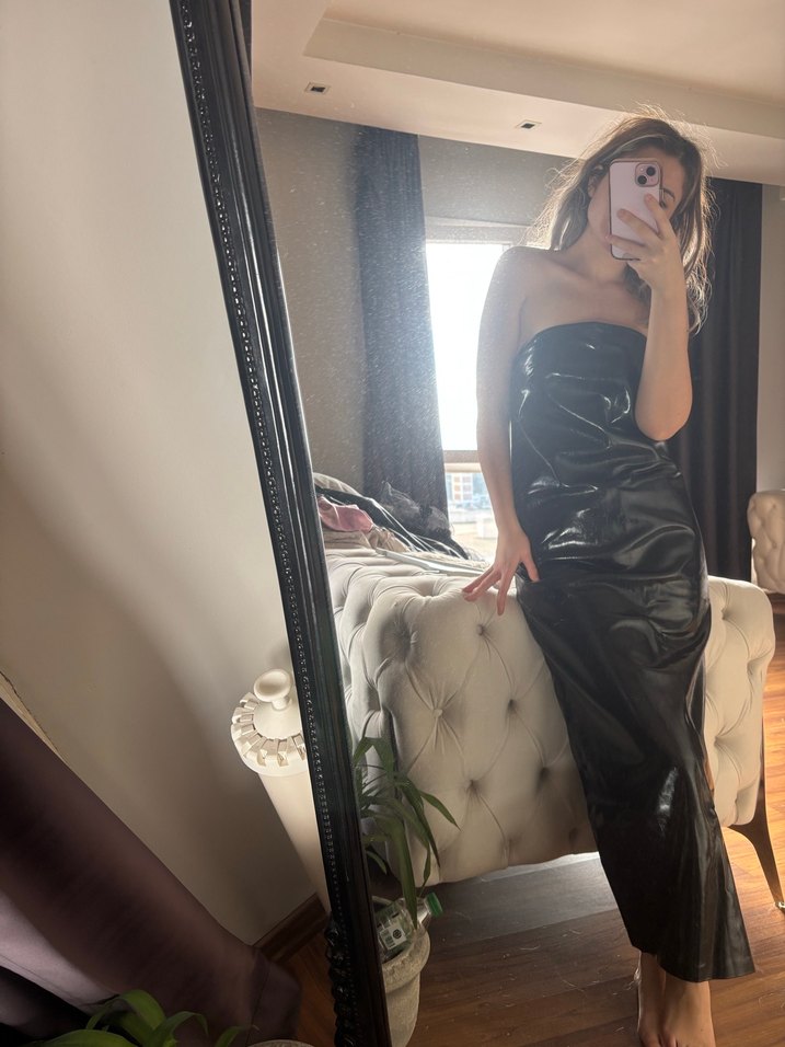 Bana bol geliyor. Zaten kullanmıycam. M beden . siyah deri, straplez yakalı ve vücuda oturan uzun elbise, romantik gece için göz alıcı gotik tarz sunar. ✨