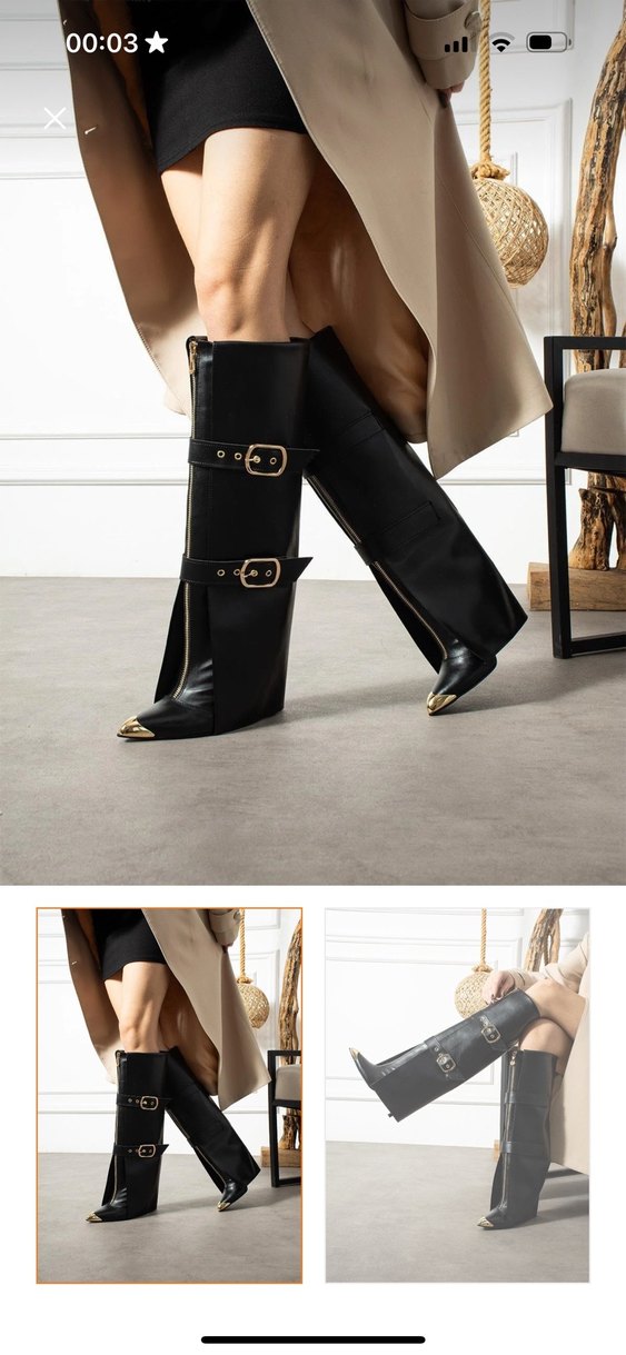 Siyah parlak deri, tokalı ve ince topuklu dizüstü botlar. Desensiz ve şık, ofis için çağdaş bir tarz sunar.