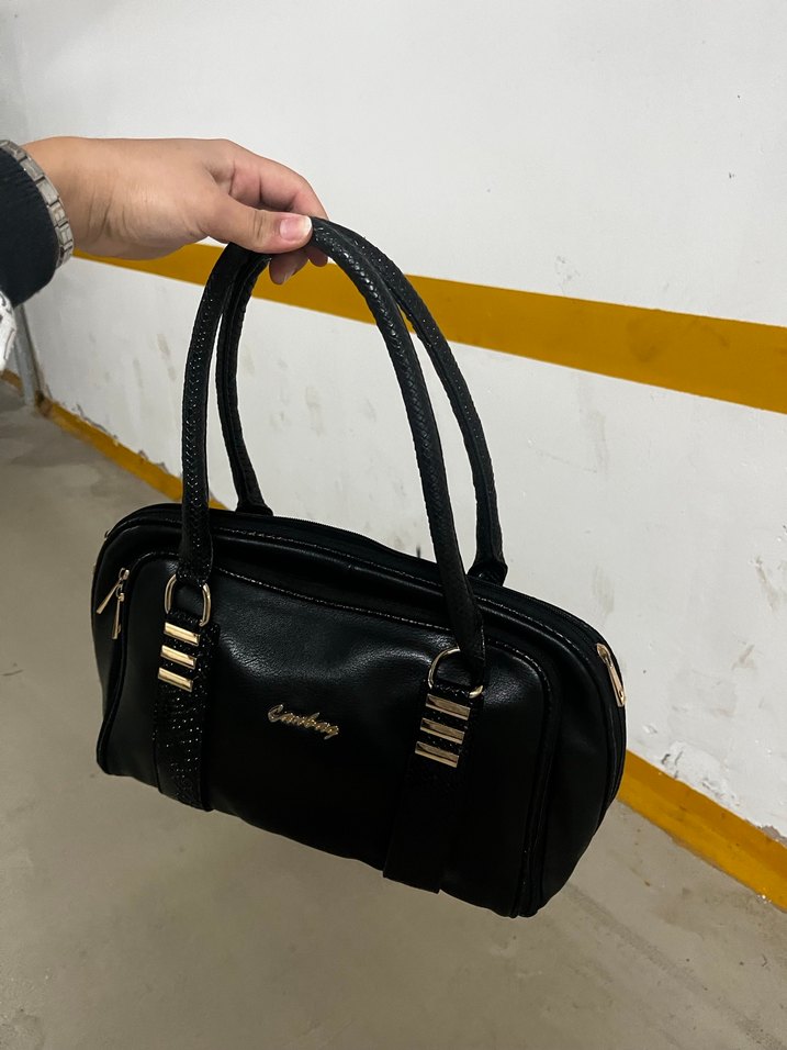 Tokalı sapları ve parlak siyah deri yüzeyiyle minimalist, goth tarzında kadın çantası. Trendy casual günlük kullanıma uygun.