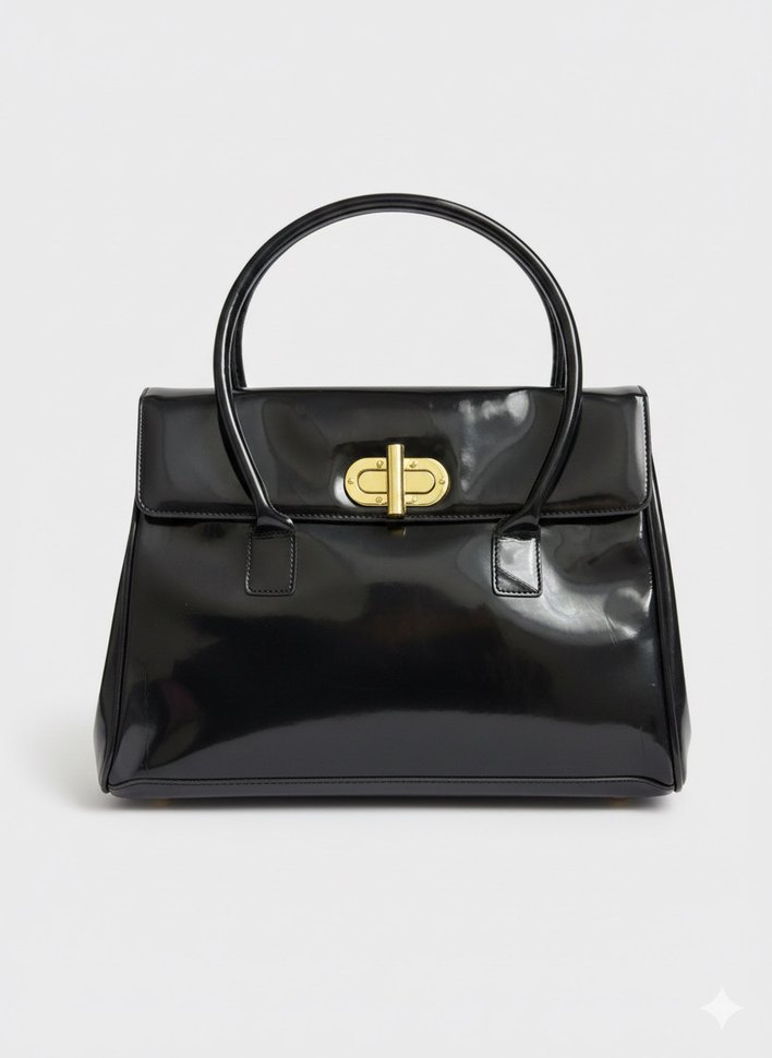 Siyah parlak deri, tokalı kapama ve yuvarlak saplı kadın çantası, ofis için modern klasik tarzda.