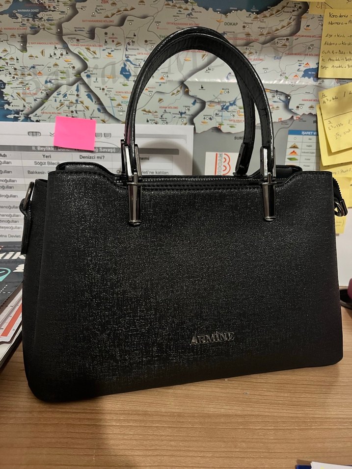 Bu siyah deri çanta parlak yüzeye, baskılı desene ve tokalı detaylara sahiptir, günlük ve iş kullanımı için uygundur.