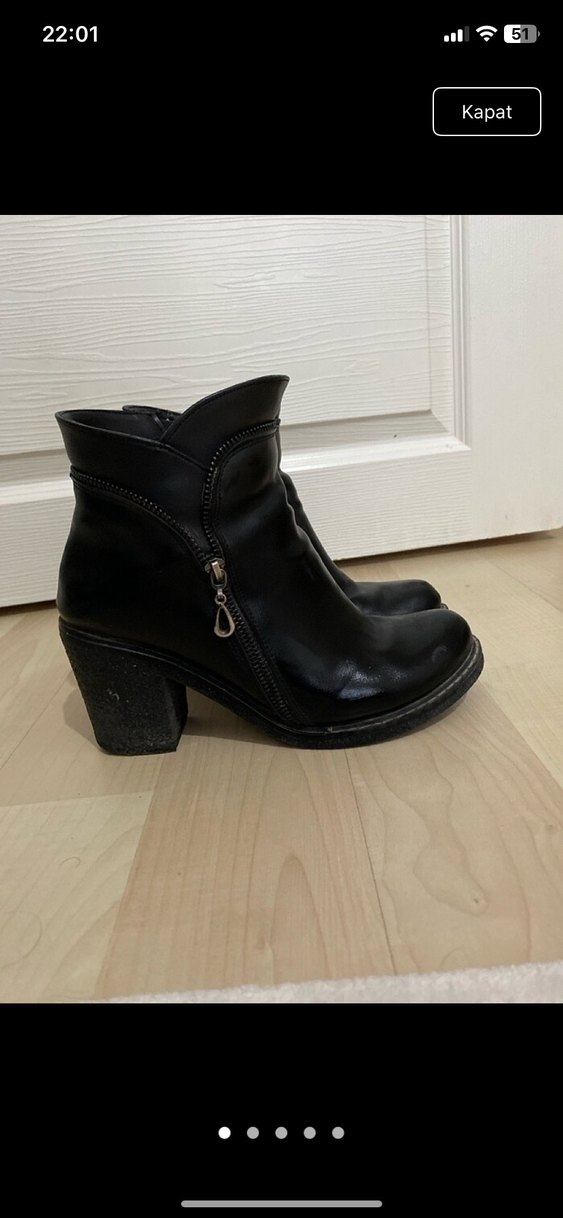 Siyah parlak deri, tokalı ve yan fermuarlı topuklu botlar. Günlük kullanıma uygun, trend sokak stili görünümü sağlar..mj