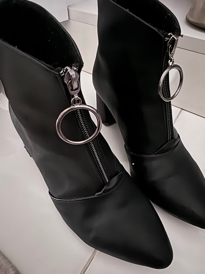 Önden fermuarlı ve tokalı detaylı siyah parlak deri kadın topuklu bot, şık gotik tarzıyla dikkat çekiyor.