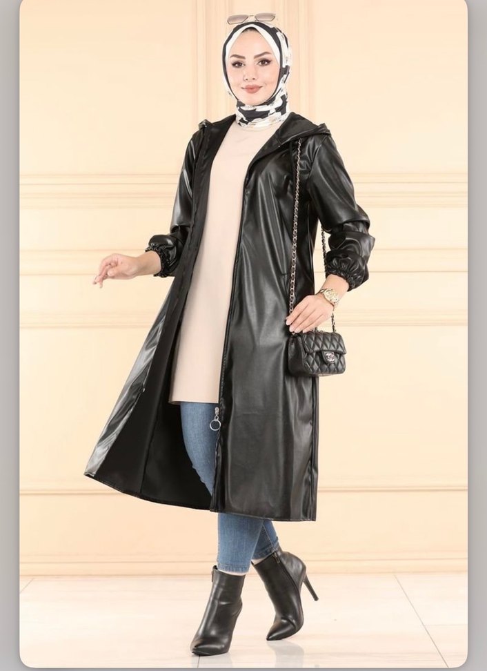 Siyah parlak deri uzun trençkot, kemerli ve notlu yakalı, bol kesimle trendy casual sokak stiline uygun. Uzun kollu ve desensizdir.