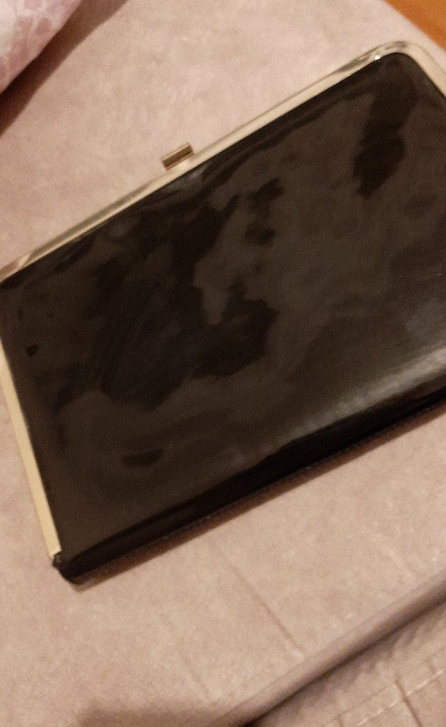 Parlak siyah deri ve desen içermeyen vintage tarzda kadın portföy çanta, ofis kullanımı için uygun.