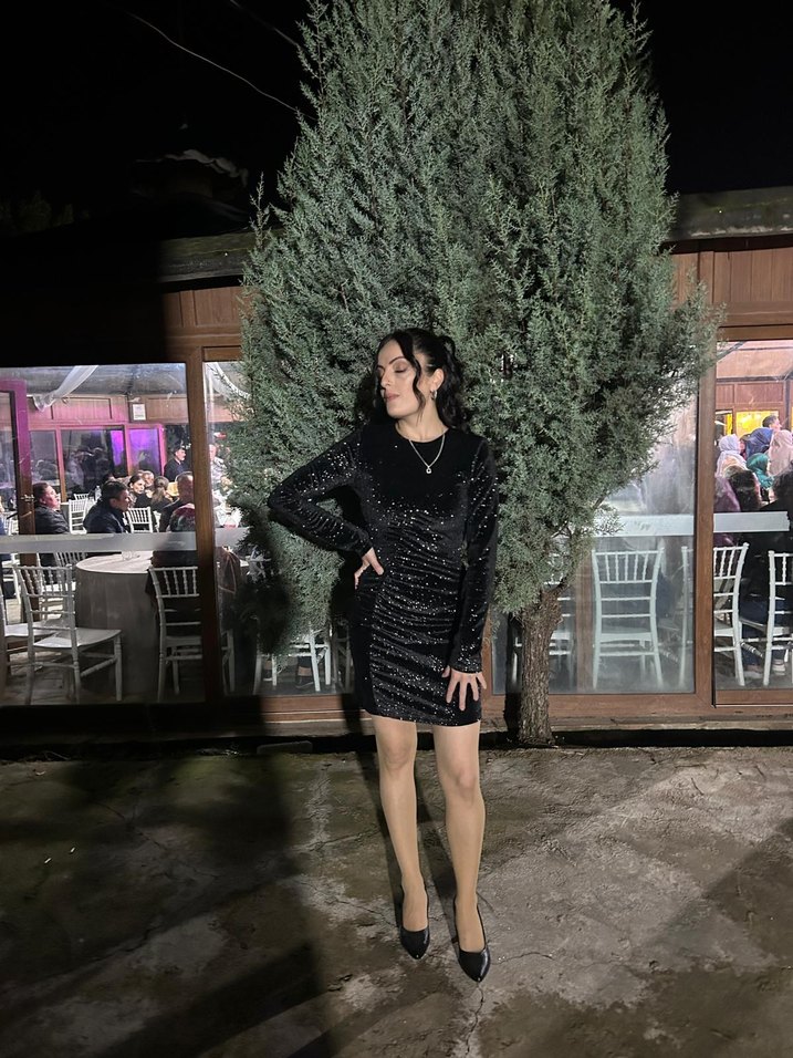 Uzun kollu, yüksek yakalı, parlak siyah mini elbise, parti için uygun. ✨