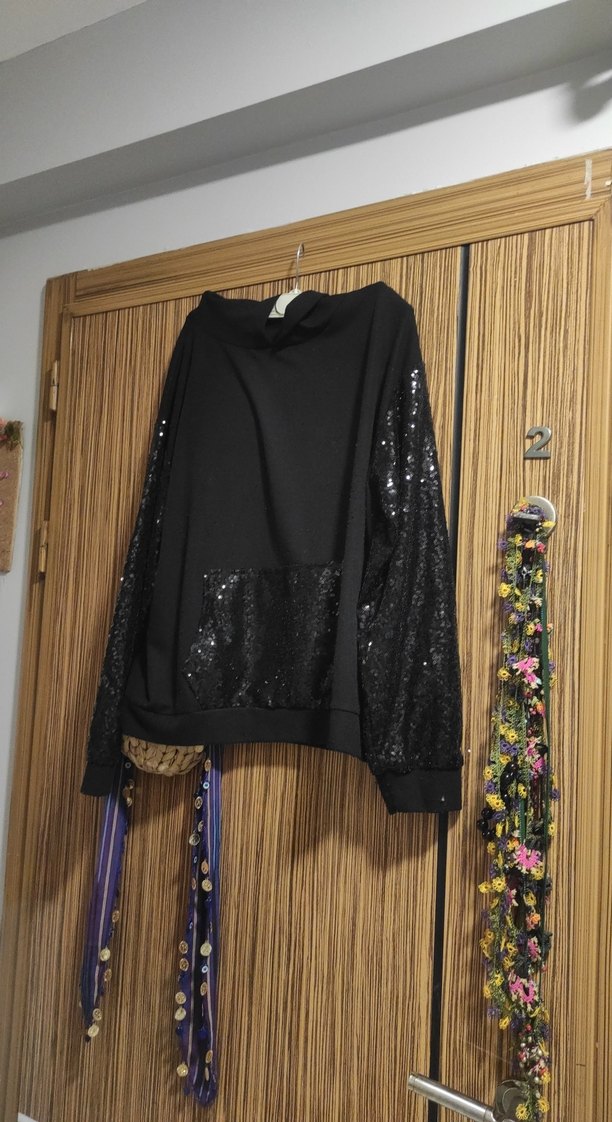 Siyah, uzun kesim, bol kesim kapüşonlu sweatshirt. Parlak baskılı kollar ve ön cep detayına sahip, yumuşak sentetik kumaştan yapılmıştır. ✨