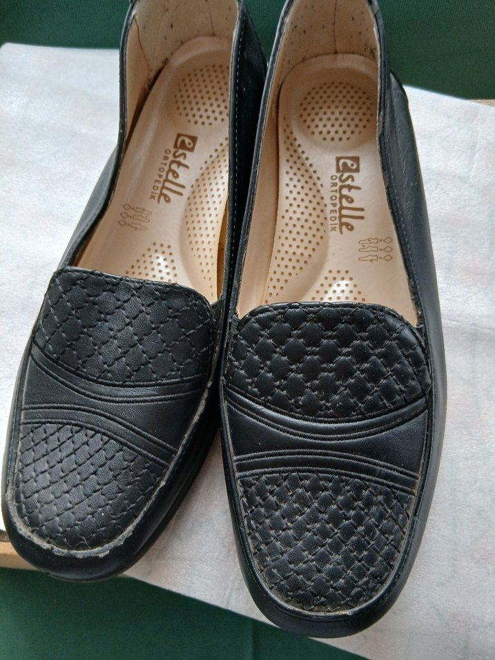 Siyah parlak dolgu topuklu, tokalı ve yılan derisi desenli günlük kullanıma uygun kadın babet. İç kısmında Estelle markası yer alır. ortopedik bir üründür. hiç bir kusuru yoktur.