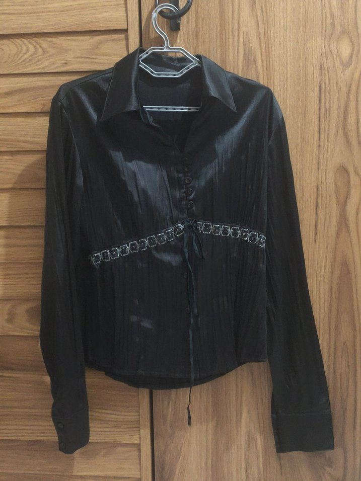 Siyah, parlak ve düğmeli gotik kadın gömleği, uzun kollu ve yakası kesimli. İpeksi kumaştan, ofis için uygun şık bir tasarım. ✨