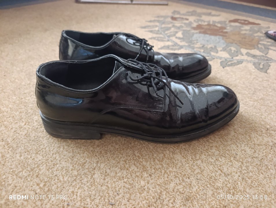 Siyah parlak yüzeyli, kauçuk tabanlı erkek klasik ayakkabı. Ofis kullanımına uygun, desen içermeyen koyu goth tarzında.az giyilmis