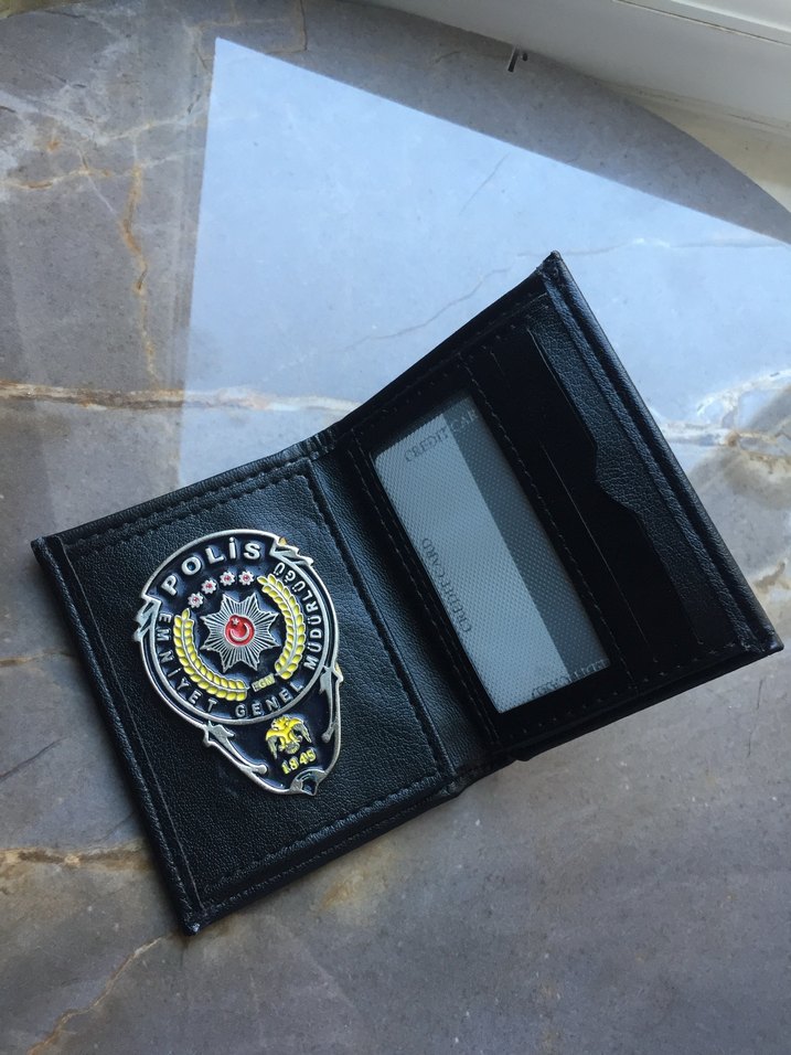 Siyah parlak biker tarzı erkek cüzdanı, baskılı desen ve polis amblemi detayıyla. Kart ve kimlik bölmeleri bulunur.