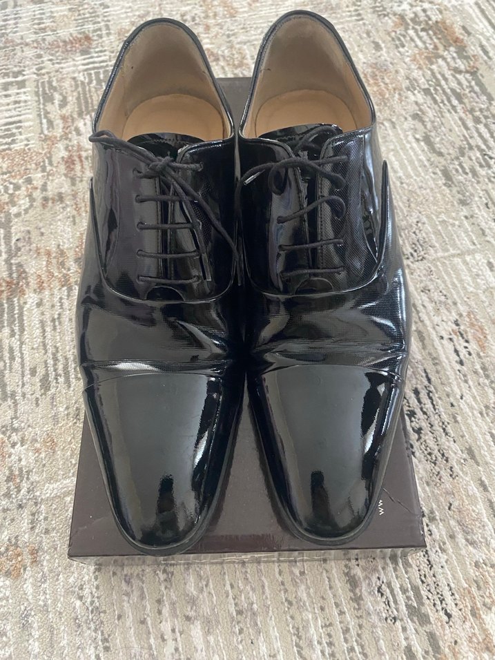Siyah parlak yüzeye sahip, desen içermeyen erkek klasik ayakkabılar. Kauçuk tabanlı, ofis kullanımı için uygundur. Rugan parlak çok şık bir kere mezuniyette giyildi görüldüğü gibi #nevzatonay #iskarpin #ayakkabı