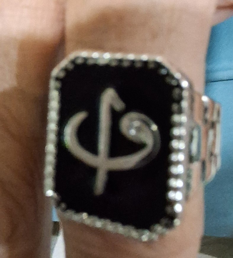 Bu erkek yüzüğü, siyah parlak yüzeyde minimalist karşı kültür tasarımı ve küçük süslemelerle sade bir görünüm sunar.