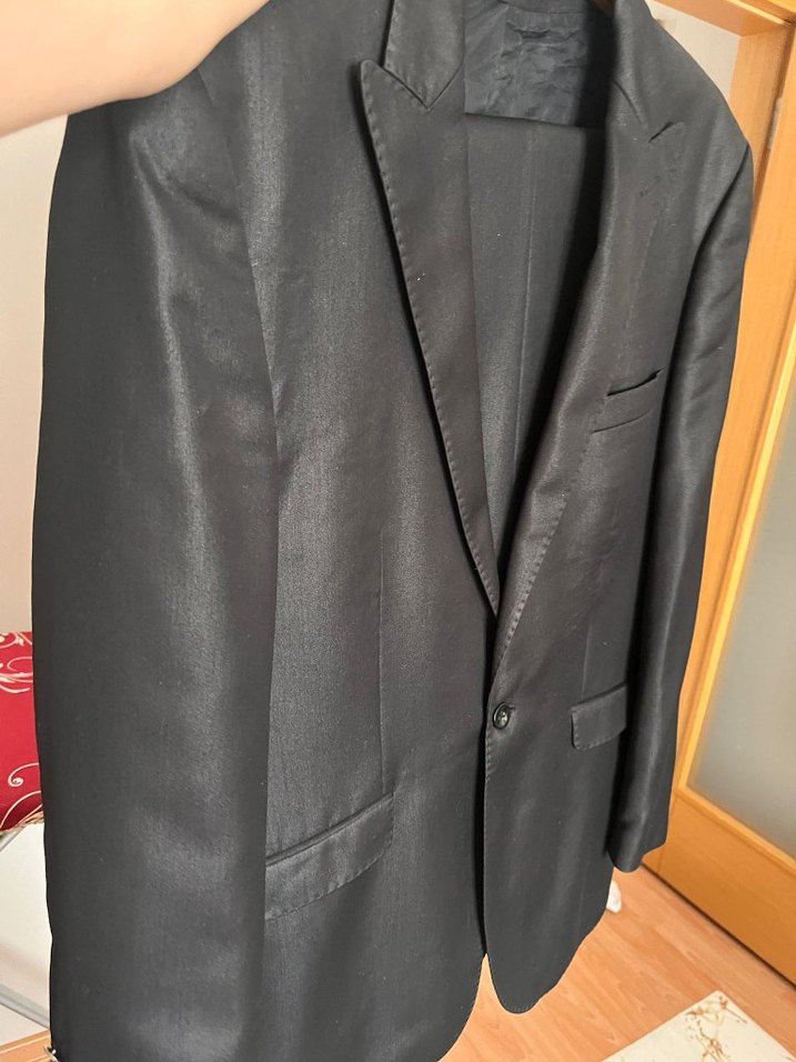 Siyah parlak erkek takım elbise ceketi, kesilmiş yakalı ve düğmeli. Normal kesim, uzun kollu, klasik ve çağdaş tarzda, ofis için uygun. ️