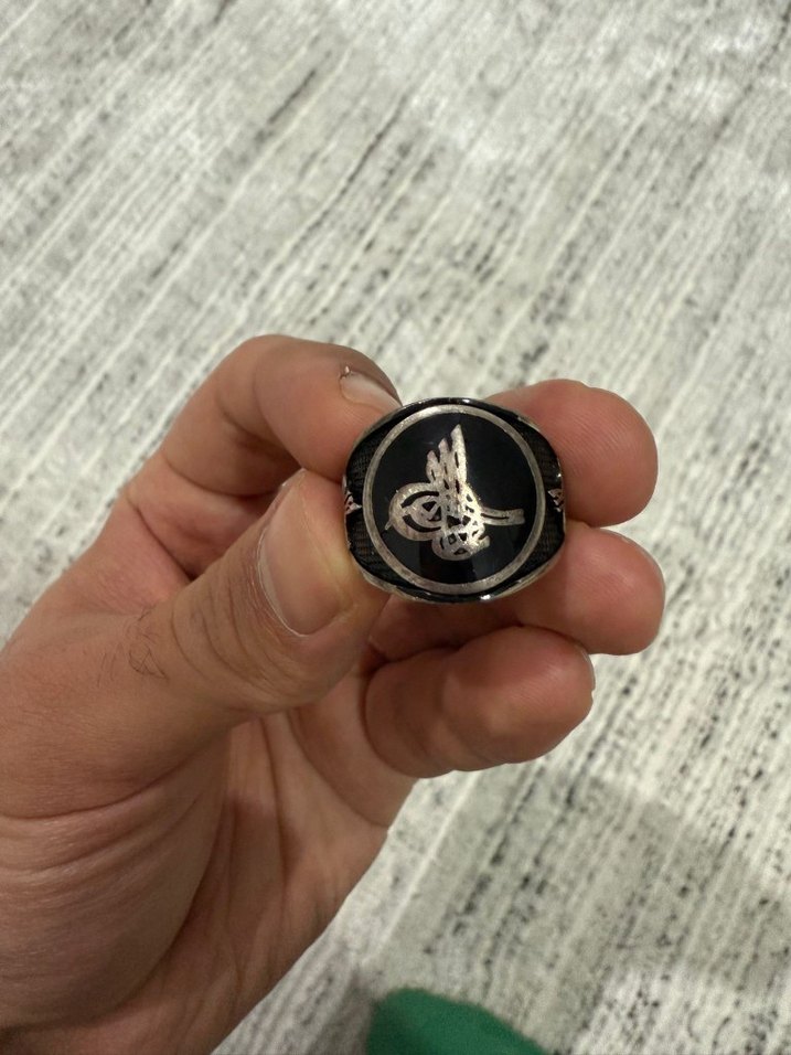 Siyah Parlak Erkek Yüzük 925 Ayar Gümüş Osmanlı Tuğrası