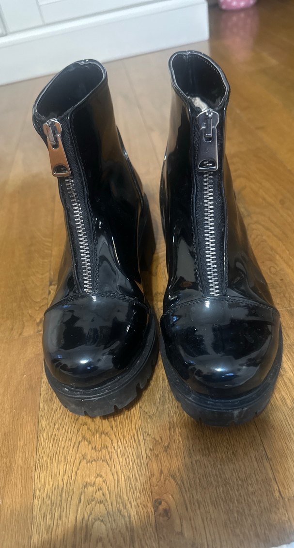 Siyah parlak kauçuk kadın botlar, blok topuklu, ön fermuarlı , gotik ve punk tarzlar için uygun.