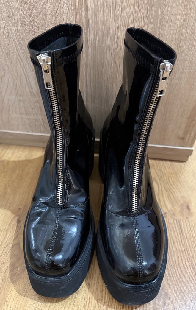 Siyah parlak blok topuklu ve önden fermuarlı gotik tarzda botlar.