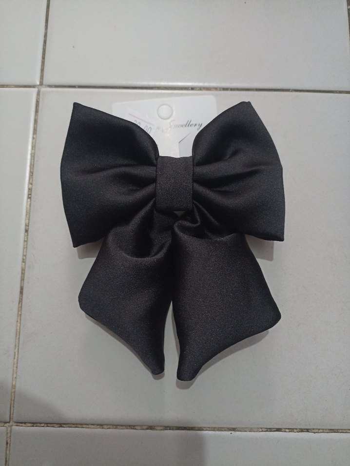Siyah, ipeksi kumaştan yapılmış büyük fiyonk şeklinde saç aksesuarı, gotik tarzda ve klasik zarafeti yansıtır.